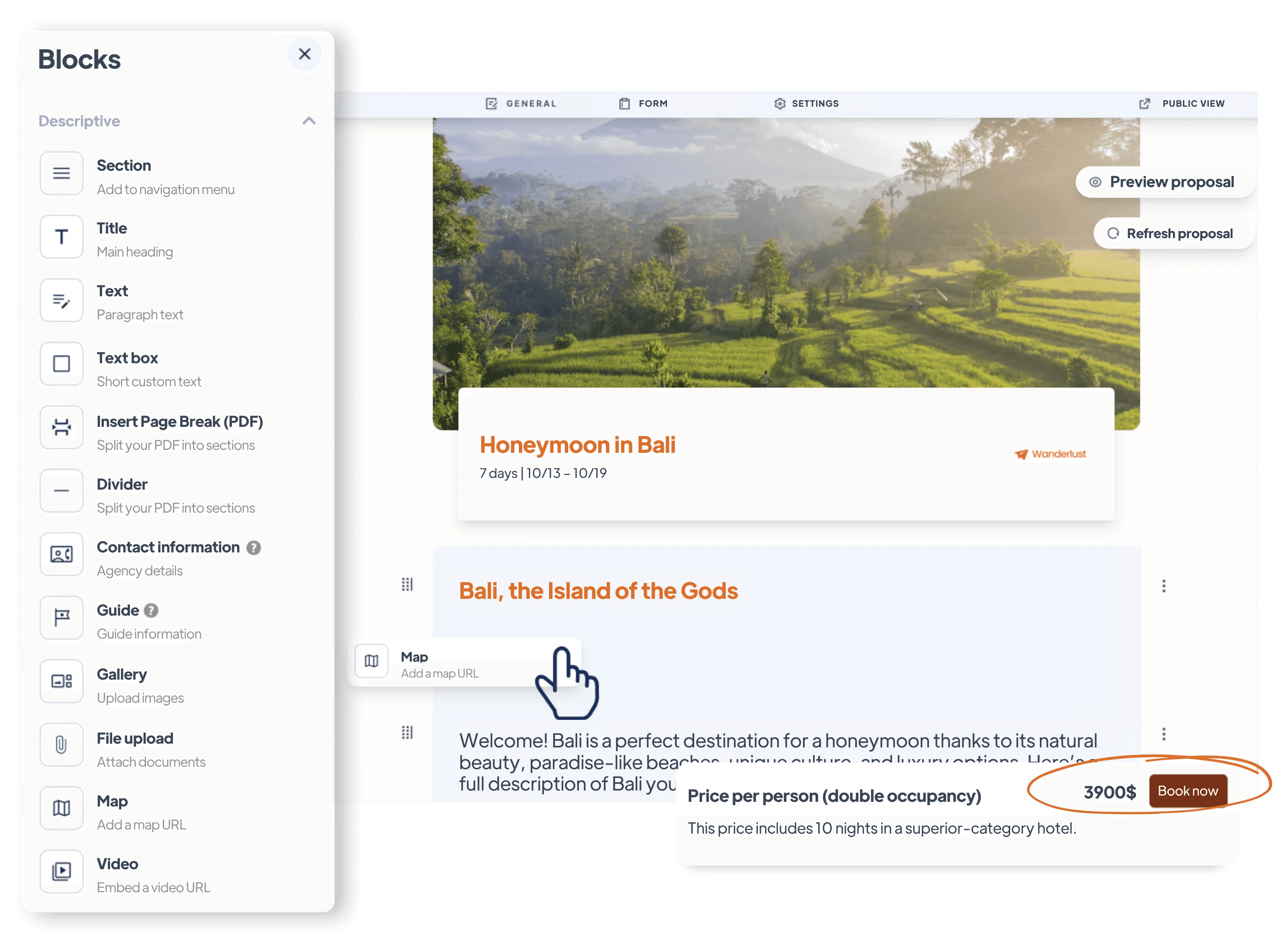 Quickly upload trip details, personalize with your logo and the couple's names, and share via WhatsApp, social media or email.