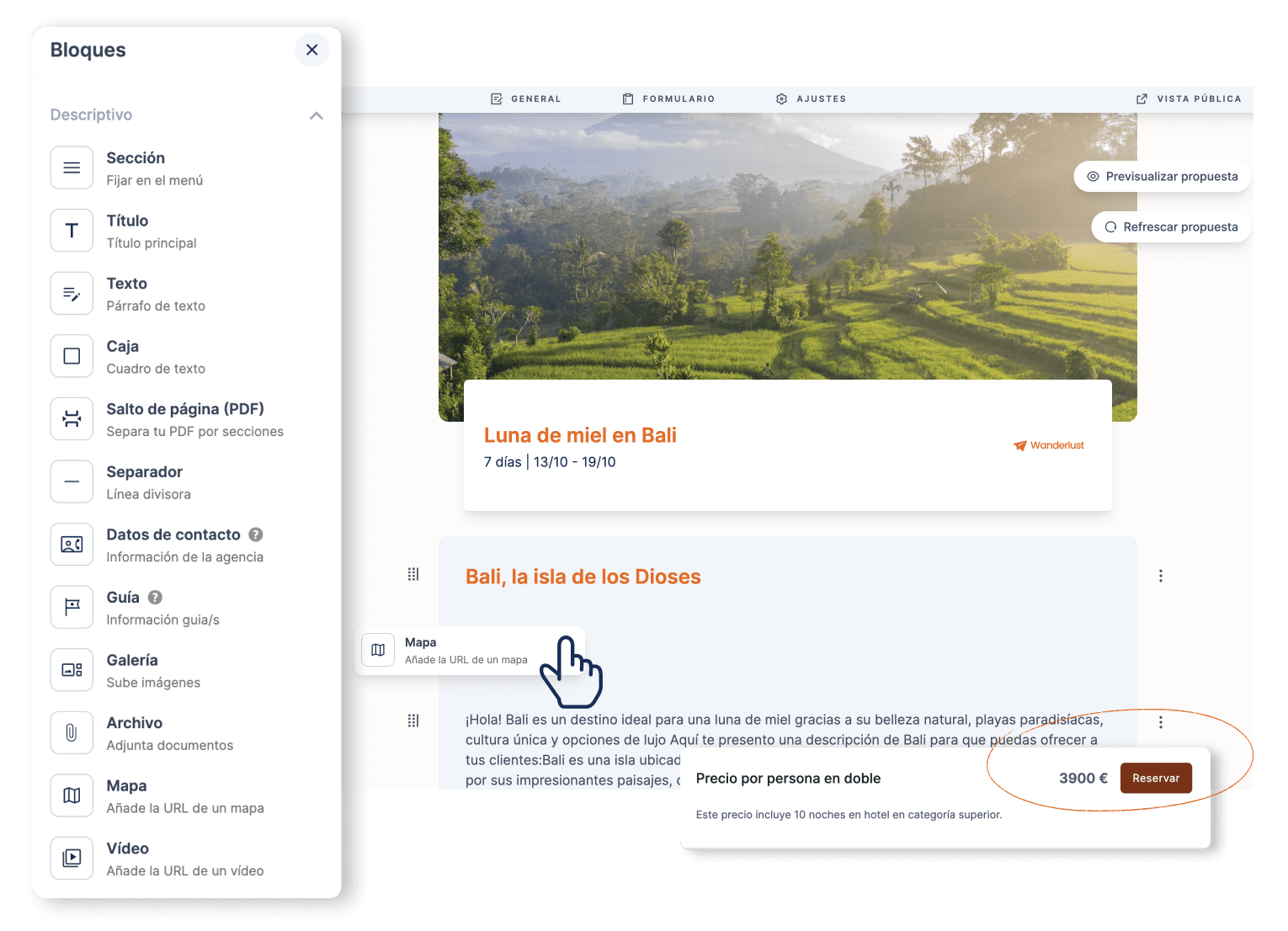 El constructor por bloques de MOGU permite crear presentaciones de viaje de manera sencilla y rápida mediante un sistema de arrastrar y soltar bloques de contenido.
